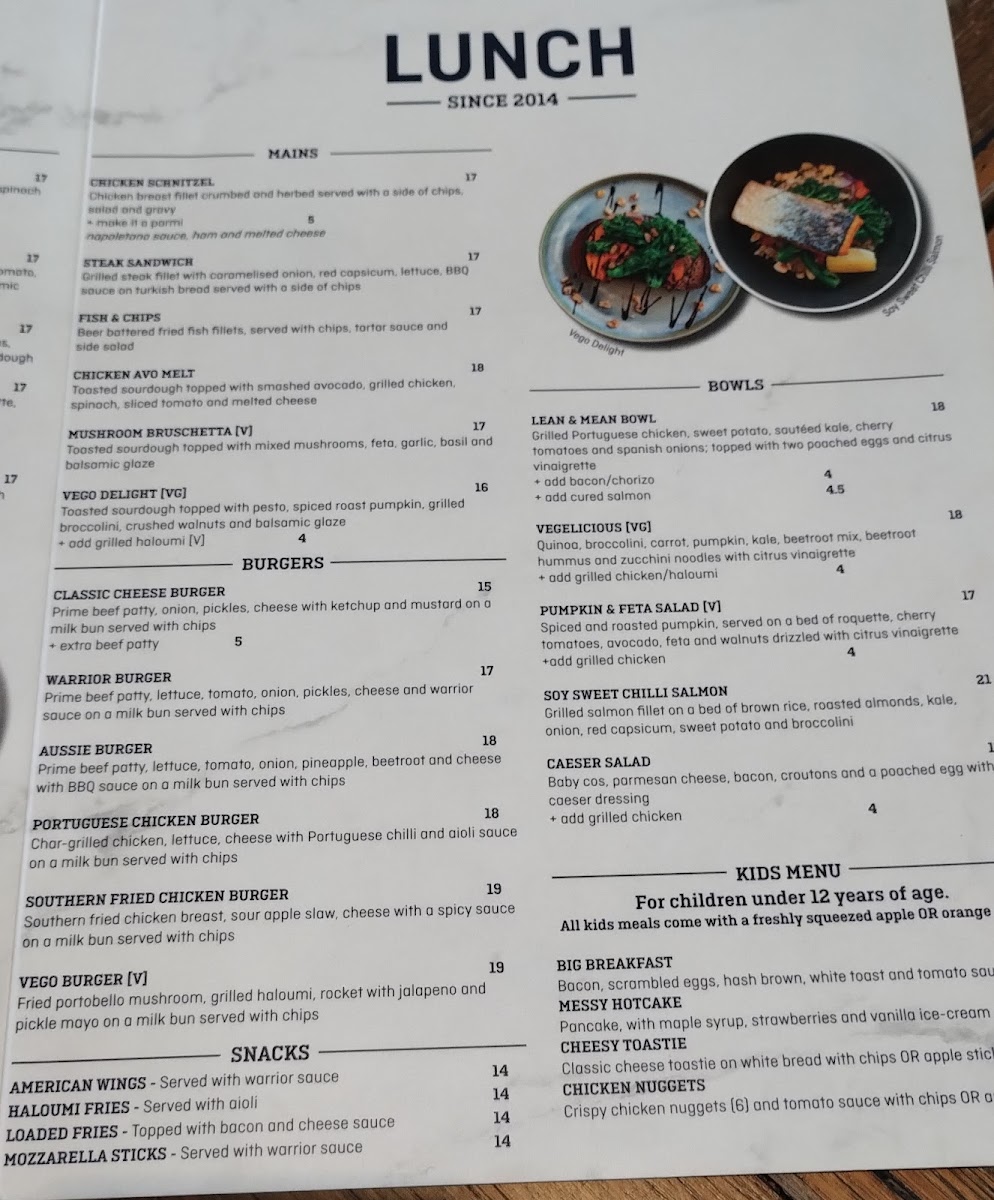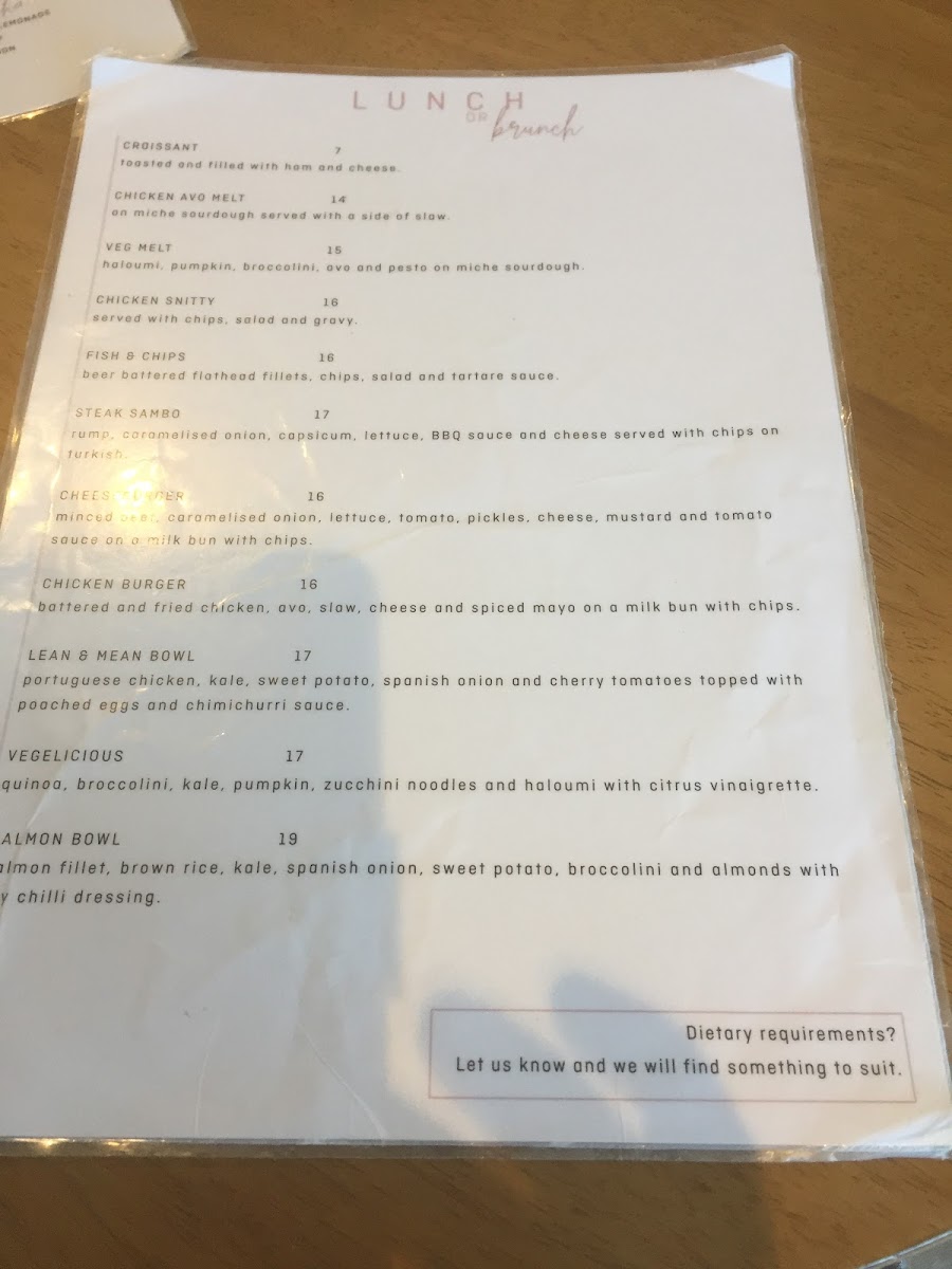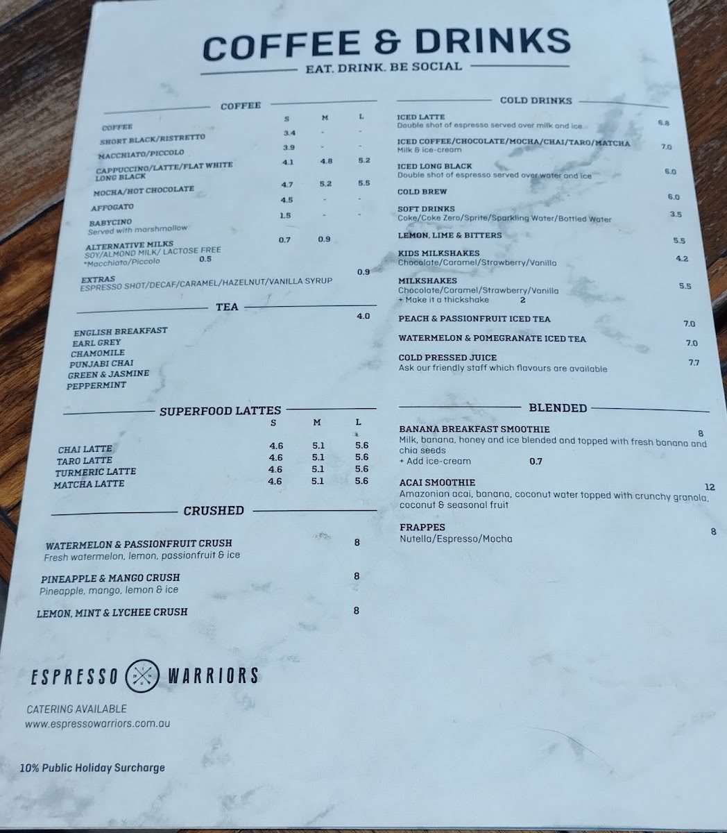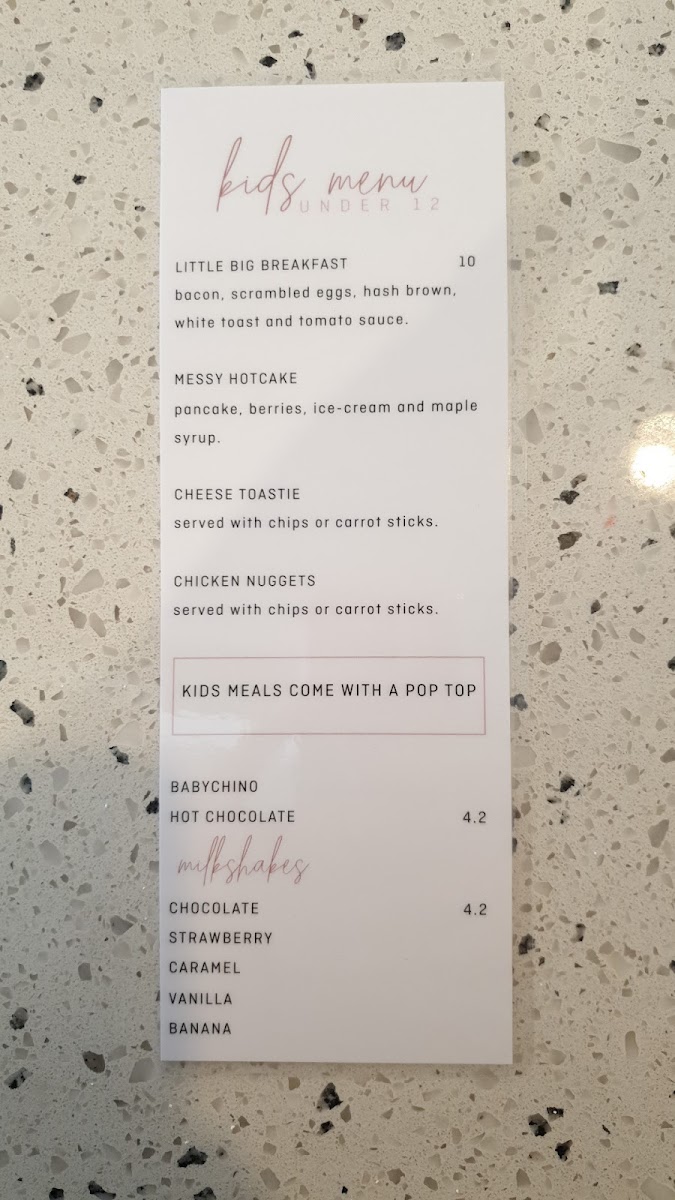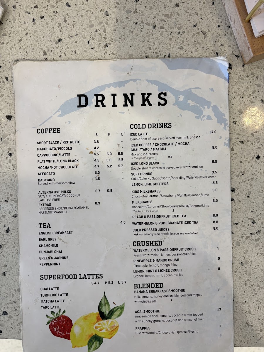 Coffee and Hot Beverages: A variety of coffee options are offered, including popular choices like Piccolo, Flat White Coffee, Iced Latte, Caramel Latte, Large Latte, and Babychino, suitable for different coffee preferences throughout the day.